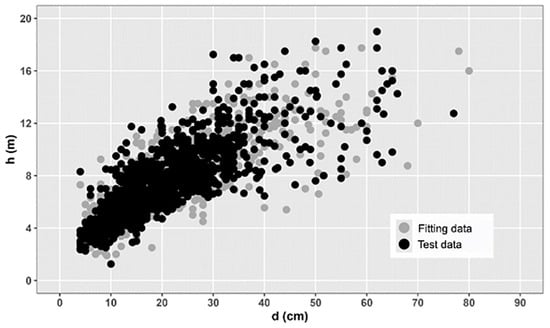 The relationship between total height and diameter at breast height for both the fitting and test datasets is illustrated in Figure 2. The two datasets exhibit similar value ranges, and total height displays a consistent pattern of variance across the d range. Notably, the highest variance in height is observed among larger trees. Overall, the height–diameter relationship can be characterized as nonlinear.