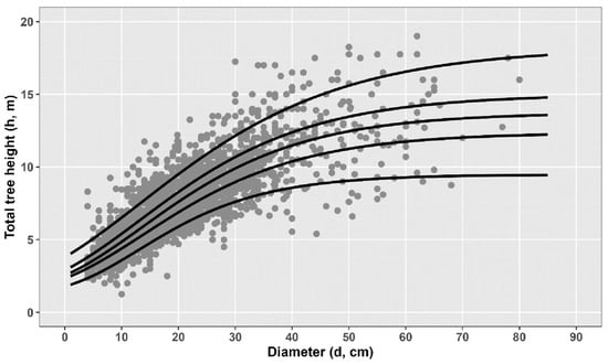 The QR models were developed using the nonlinear programming (NLP) procedure in SAS [65]. If a plot contains only one observed tree height (m = 1), the objective is to generate two QR curves that closely approximate this observed tree height. If is covered by the kth and (k + 1)th quantile regressions, i.e., , a modified h–d curve which passes along that point is created by interpolation: