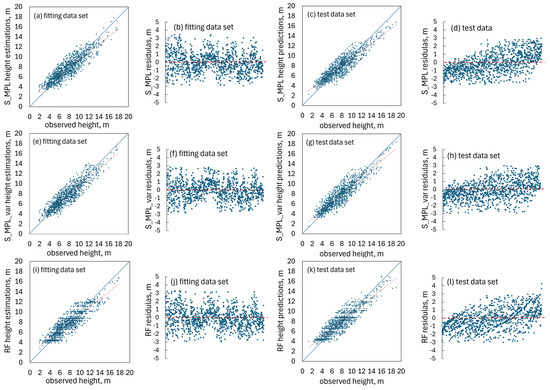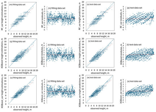 The evaluation metrics were used to compare the selected best-fitted models from each modeling approach. The interest was not just in the models’ ability to accurately estimate the total tree height but also in their generalization ability to be assessed. The metrics reflecting estimation performance were derived from the fitting dataset (49 plots), while those assessing predictive performance were based on the test dataset (49 plots, different from those of the fitting data set).