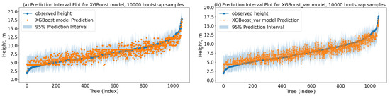 When two or more trees are measured in each plot (m ≥ 2), the mean difference between predicted and measured tree heights was calculated for each QR curve. This mean difference changed sign between two successive quantile regressions (kth and (k + 1)th). If most tree height observations were below the lowest (1st) QR curve and the mean difference was positive for all QR curves, and in Equation (20) were defined as and , respectively. Conversely, if the mean difference was negative for all QR curves, and were defined as and , respectively. In both scenarios, the interpolation ratio was determined to minimize , where is the tree height is estimated from Equation (20). The calibrated responses were evaluated for different alternatives of height sampling design and sampling size within each plot for the ME and QR models using test data.