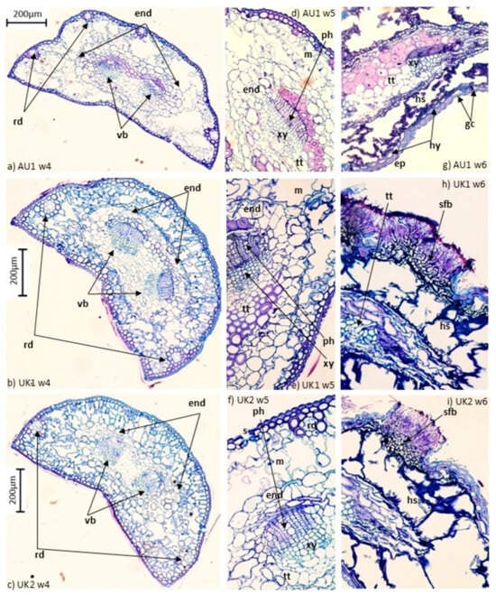 Cross sections (CS) of Pinus sylvestris needles following inoculation with Dothistroma septosporum. (a–c) CS full needle in the fourth week after inoculation showing the early stage of collapsing mesophyll and endodermis with intact transfusion tissue and vascular bundles; (d–f) expanded cross-sectional views in the fifth week of infection showing collapsed mesophyll and endodermis and the outset of disintegrating transfusion tissue; (g–i) expanded cross-sectional views in the sixth week of infection, where the transfusion tissue is collapsed, with hyphae in intracellular spaces of the collapsed mesophyll and soporiferous fruiting body. end, endodermis; vb, vascular bundle; rd, resin duct; m, mesophyll; ph, phloem; xy, xylem; tt, transfusion tissue; ep, epidermis; hy, hypodermis; gc, guardian cell; hs, hyphae structure; sfb, soporiferous fruiting body.