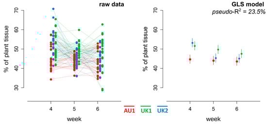 Graphical representation of raw data and constructed GLS model. The left panel displays raw data for the percentage of healthy (non-degraded) plant tissue across three seed sources (AU1—red, UK1—green, UK2—blue) at weeks 4, 5, and 6 post-inoculation. Each dot represents an individual plant needle section; dots are connected to illustrate temporal changes. The right panel shows the corresponding predicted values from a generalized least squares model. Colored points and vertical lines represent estimated mean values with corresponding 95% confidence intervals for each seed source × time interaction. Overlapping intervals indicate the absence of a significant difference.