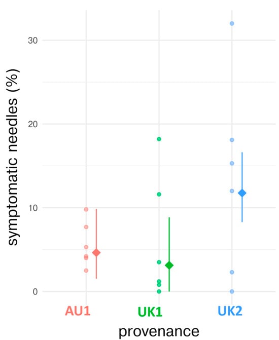 The fixed effect of seed source had no significant influence on disease severity (expressed as a percentage of symptomatic needles). Specifically, provenance AU1 had a symptomatic needle percentage of 4.6% (SE = 2.6, df = 15, t-value = 1.790, p = 0.094; Figure 3 and Table 5). Compared to AU1, seed source UK1 showed a reduction in symptomatic needles by −1.5% (n.s.; SE = 3.9, df = 15, t-value = −0.381, p = 0.709; Figure 3 and Table 5). In contrast, symptoms on needles from the UK2 seed source increased by 7.1%, compared with AU1 (n.s.; SE = 3.8, df = 15, t-value = 1.854, p = 0.084; Figure 3 and Table 5). The model constructed with these data, therefore, cannot be used to make conclusive assertions about the role of seed source in determining disease severity. The random effect associated with Block yielded a variance of almost zero, indicating that the inclusion of this term did not explain a significant proportion of the observed variability in symptomatic needle percentages.