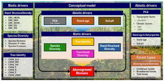 - Wang, L.Q.; Ali, A. Functional identity regulates aboveground biomass better than trait diversity along abiotic conditions in global forest metacommunities. Ecography 2022, 2022, e05854. [Google Scholar] [CrossRef]