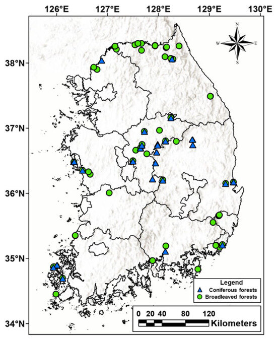 - Son, Y.M.; Kim, R.H.; Lee, K.H.; Pyo, J.K.; Kim, S.W.; Hwang, J.S.; Lee, S.J. Carbon Emission Factors and Biomass Allometric Equations by Species in Korea; Korea Forest Research Institute Report; National Institute of Forest Science: Seoul, Republic of Korea, 2014; pp. 14–18. [Google Scholar]