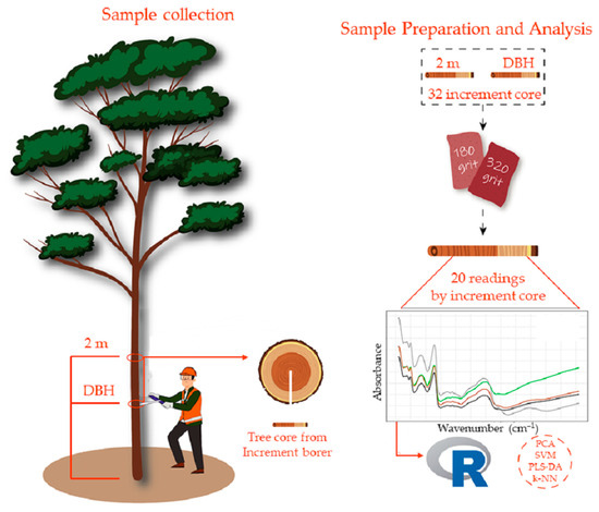 Spectra were acquired using a Vertex 70 spectrophotometer (Bruker Optics, Ettlingen, Germany), operating in diffuse reflectance mode, with a resolution of 8 cm−1, in a spectral range of 4000–10,000 cm−1. Since the sample preparation can directly influence the NIR spectra [12], and to represent the methods commonly applied for wood transportation, the spectra were collected directly from the increment core surfaces, and no separation of heartwood and sapwood was performed.