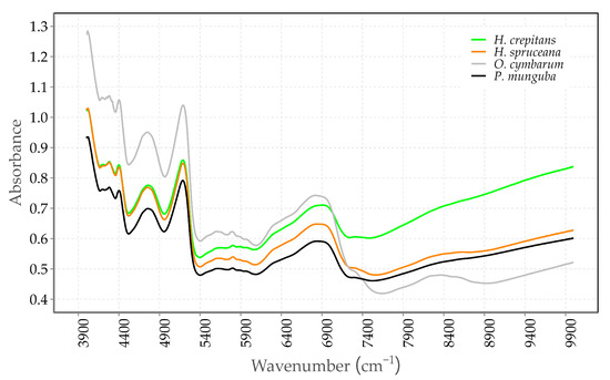 The average NIR spectra for the four Amazonian floodplain species, in the wavenumbers from 4000 cm−1 to 10,000 cm−1 (Figure 2), exhibited similar behaviors, but with different absorbance intensities. In general, from the initial spectra wavenumber to 7400 cm−1, lower absorbance values were observed for the species P. munguba; after this spectral range, the species O. cymbarum presented a lower absorbance value (Figure 2). Throughout the entire spectral wavenumber interval, the species H. spruceana and P. munguba presented similar absorbance values. In the range from 7400 cm⁻1 to 9900 cm−1, H. crepitans spectra showed a tendency to separate from the others due to a greater increase in absorbance intensity (Figure 2).