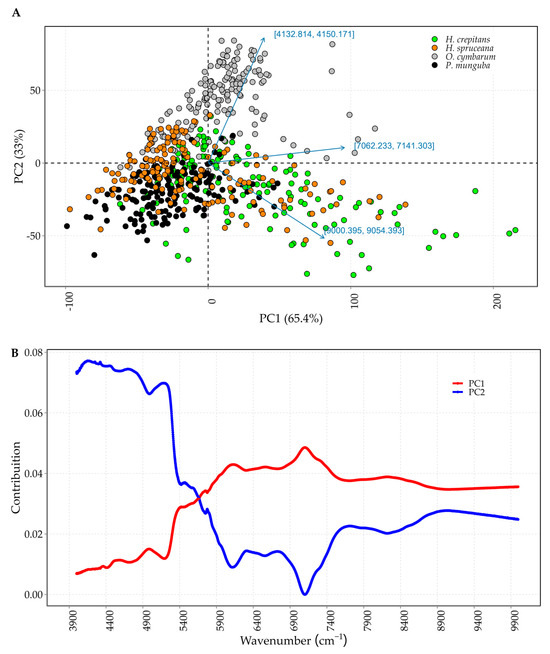 Spectral similarities between species were also observed by Soares et al. [31], who reported the need for chemometric techniques to differentiate Amazonian species. Santos et al. [8] highlighted that, despite the similarities in NIR spectra, the distinctions between species occur mainly through absorbance intensity, a pattern identified in the present study.