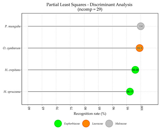 Figure 4 shows recognition rate in the most accurate PLS-DA classification for the validation samples per species. The best performance in species recognition was achieved by the PLS-DA classifier for P. munguba, with 100% recognition (Figure 4). Overall, all of the species evaluated showed excellent recognition rates, being above 96%.