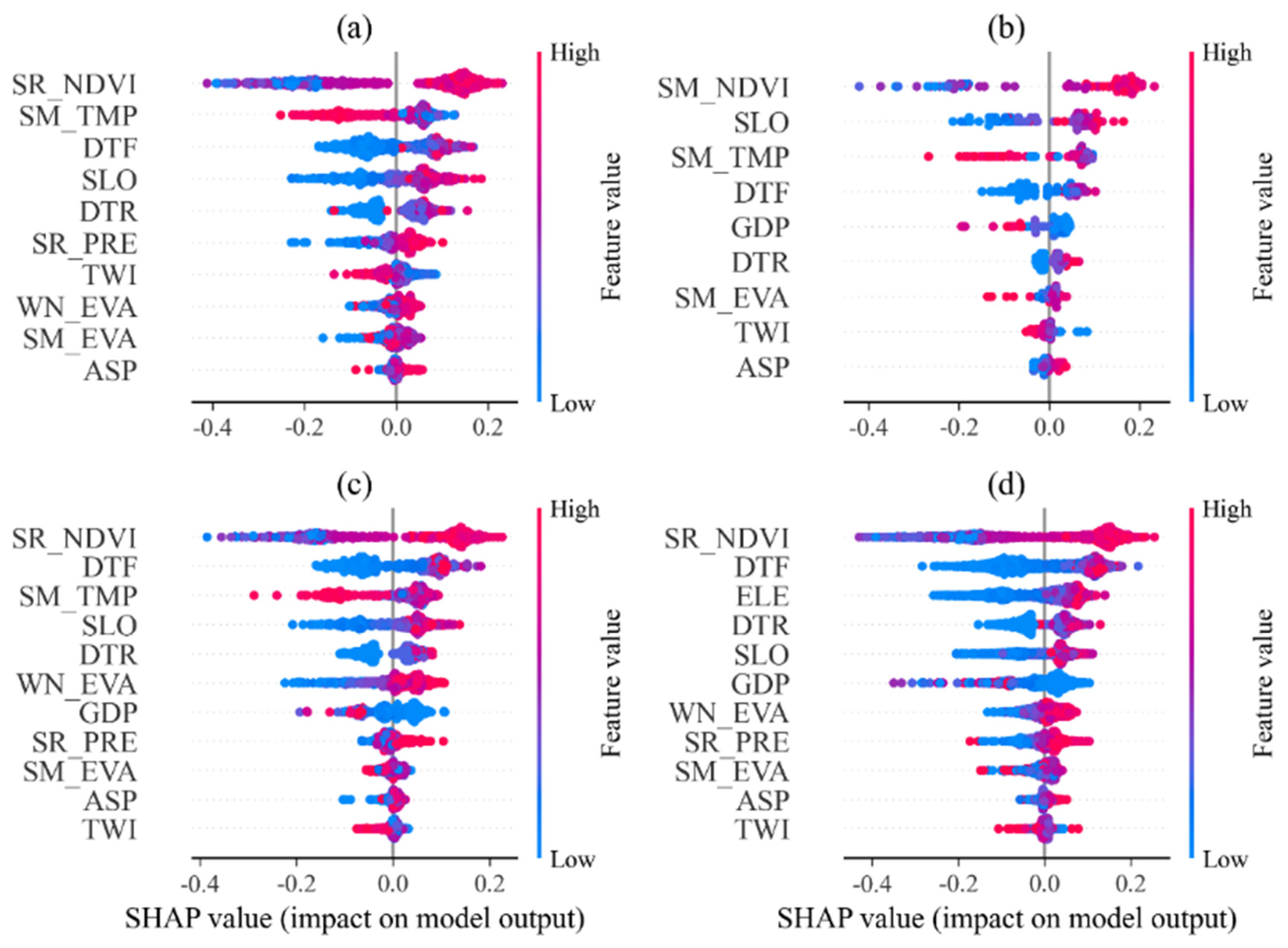 The SHAP value analysis results for the spring, summer, fall, and winter wildfire prediction models are illustrated in Figure 9a–d. These visualizations provide detailed insights into how individual factors contribute to the wildfire occurrence across different seasons. In each subfigure, the horizontal axis represents the magnitude and direction of the SHAP values—where negative values indicate a decrease in the wildfire danger and positive values indicate an increase. The vertical axis lists the corresponding features. The color gradient from dark blue to bright red reflects the feature value range from low to high. Each point represents a sample, and the scatter distribution illustrates the complex relationships between the variable values and the wildfire danger.