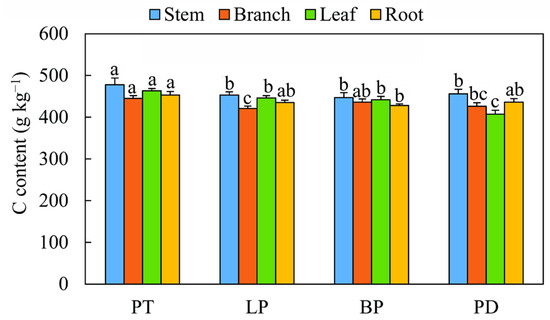 The differences in C contents of each organ were significant among different tree species (p < 0.05). The stem of PT had the maximum C content, with a mean value of 478.5 g kg−1 among the four tree species. Meanwhile, the leaf of PD had the minimum C content, with a mean value of 407.4 g kg−1. The C content of different tree organs decreased sequentially with stem > leaf > root > branch (Figure 1).