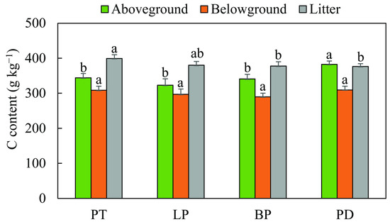 In Figure 2, the average C content of the herbs in the PD plantation (345.8 g kg−1) was significantly higher compared to the other plantations (315.2–326.1 g kg−1) (p < 0.05). Across all plantations, the aboveground components of herbs showed higher C contents than the belowground components. The C content of litter was the highest (399.1 g kg−1) in the PT plantation stand and was significantly higher than those of broadleaved plantation stands (p < 0.05).