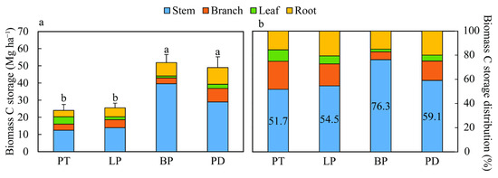 BP and PD plantations had significantly higher tree layer C storage than those of the other two coniferous plantation types (p < 0.05). The tree layer C storage was 24.0 Mg ha−1 in the PT plantation, 25.5 Mg ha−1 in the LP plantation, 51.9 Mg ha−1 in the BP plantation, and 49.0 Mg ha−1 in the PD plantation, respectively (Figure 3a). All plantations showed a common tendency where stems accounted for a large distribution (51.7%–76.3%) of biomass C storage. The C storage of leaves among the four plantation types was comparatively small, ranging from 2.1% to 9.4% of the whole biomass C storage. Roots stored about 15.6%, 20.6%, 15.1%, and 20.0% of the whole biomass C storage in the four plantations (Figure 3b).