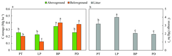 The C storage of the herbs ranged between 0.3 Mg ha−1 and 0.7 Mg ha−1 in the four plantation stands. Among the herbaceous layers, the aboveground stored more C storage in the coniferous plantation stands, while the belowground had a higher C storage in the broadleaved plantation stands (Figure 4a). The litter C storage was significantly greater in the LP (4.0 Mg ha−1) and PT stands (3.2 Mg ha−1) than those of the broadleaved plantation stands (Figure 4b).