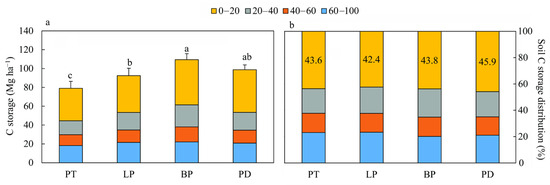 The BP plantation stand had the highest soil C storage (109.4 Mg ha−1), followed by PD (98.8 Mg ha−1) and LP (92.4 Mg ha−1) plantation stands (Figure 5a). The PT plantation stand had much lower soil C storage than other plantation stands (p < 0.05). In the four plantation stands, the topsoil (0–20 cm) layer stored the most carbon, ranging from 42.4% to 45.9% of the total soil C storage (Figure 5b).