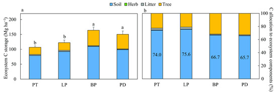 Ecosystem C storage (Mg ha−1) (a) and C allocation to ecosystem component (%) (b) of different plantation types in North China. Different lowercase letters mean different levels of significance (p < 0.05). The errors bars represent standard deviations (n = 3).