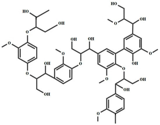 Wood as a biodegradable, renewable, and abundant natural material stands as a great alternative to petroleum-based materials. Its low-cost, good mechanical performance, and lightweight design result from a “wisely”-optimized structure for water transportation within and stiffness in living trees. However, wood’s inherent heterogeneity, anisotropy, and moderate strength limit its use in high-end structural applications [,,]. Conventional modification methods, such as thermal treatments, impregnation, chemical modifications, and coatings [,,,,,], only partially improve wood’s final properties. Treatments like steam, heat, and NH3 fuming, followed by densification, often result in low dimensional stability under moist conditions [,]. These prompts increased research into new wood-based materials with enhanced performance [] and greater possibilities. Lignin, the structural material that trees consist of, is a complex organic polymer, rich in aromatic content, which of course varies from species to species, as is the case in all natural substrates. It is a cross-linked phenolic polymer (Figure 1) in fibrous microstructure.