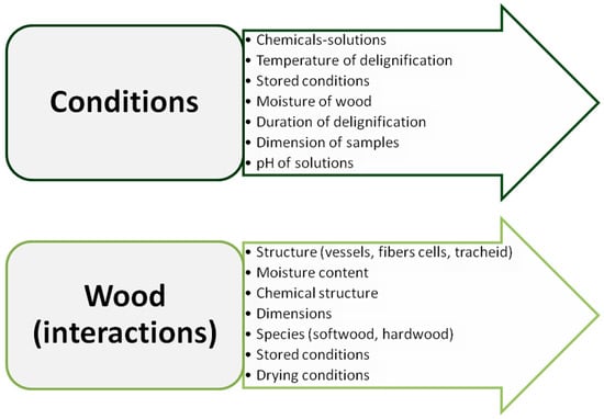 Figure 2 lists the most crucial factors that affect the delignification process, by indicating various parameters that lead to differentiations in the lignin resulted after treatment. Those factors, that will be discussed later, are divided into two categories: those that concern the milieu conditions the wood faces when treated, where the process evolves, and the characteristics/properties/qualities of the wood itself applied, thus its original nature. Treatments externally pose the chemicals and conditions for delignification to go, but the substrate—the wood—may react differently towards them, depending further on its own qualities. Figure 2 summarizes those two influential groups. More particularly, the chemical solution and the choice of chemicals used in the delignification process can affect its final efficiency. Common delignification agents include alkalis (e.g., NaOH), acids (e.g., H2SO4), and oxygen-based agents (e.g., H2O2). The concentration, temperature, and duration of exposure to these agents can also impact the effectiveness of the delignification process. At low temperatures, NaOH, Na2S, or Na2CO3 are utilized for delignification. The “Kraft process”, also known as the sulfate process for the conversion of wood into wood pulp, which consists of almost pure cellulose fibers, combines cooking in a combination of hot H2O, NaOH, and Na2S with mechanical processing processes.