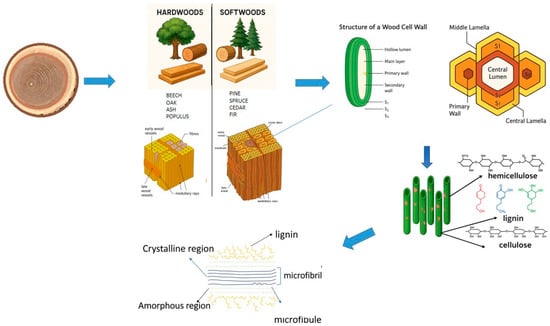 Hardwoods, on the other hand, are mostly made up of vessels and fiber cells. Hardwood fibers are exclusively responsible for mechanical support. Hardwood fibers usually are 0.2–1.2 mm long and have lower lumens than softwood tracheids. The cell walls of hardwood fibers are thicker than those of softwood and earlywood tracheids. This is because the fibers do not transport H2O, and hence, their pits are less in size as compared to softwood. Some hardwood fibers differ from softwood tracheids in their capacity to create an additional gelatinous wall layer in place of a regular S3 layer []. The cell wall structure of hardwood vessels differs from that of softwood tracheids and hardwood fibers (Figure 3). To some extent, softwoods and hardwoods have differing wood structures and chemical components. Certain hardwoods, such as fast-growing poplar, have a lower density and a looser structure than softwoods due to large-diameter fiber cells. Because of this structural difference, many hardwoods are very reactive and easily modified by chemicals. Furthermore, most hardwoods have a reduced lignin concentration. Despite the structural and compositional differences mentioned above, softwoods and hardwoods share compositional and structural characteristics (i.e., hierarchically porous structure and consisting of cellulose, hemicellulose, and lignin) [].