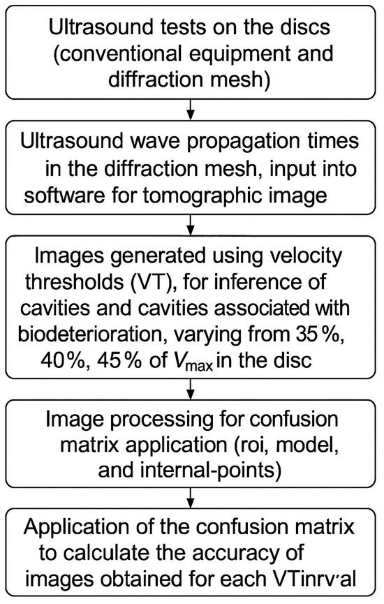 As described in the methodology, tomographic image accuracies were obtained with the objective of inferring cavities and cavities associated with decay. The images were generated using four different VTs intervals, always based on the maximum velocity obtained from the measurement paths on each disc. The accuracy results, obtained using the confusion matrix, are presented in Table 3 for the inference of cavities and in Table 4 for the inference of cavities associated with decay.