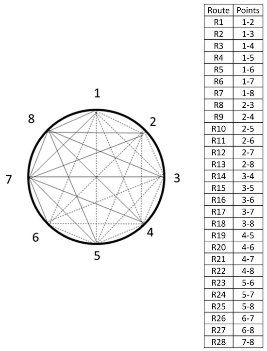 Figure 2. Example of diffraction mesh with 8 measurement points and 28 theoretical wave propagations routes.