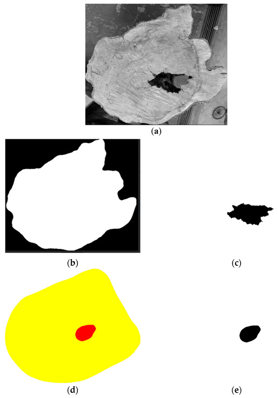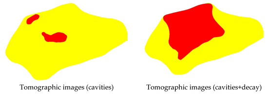 In this context, the target defects were cavities or cavities associated with decay. Thus, pixels representing these defects were considered positive, while pixels corresponding to sound wood were considered negative.