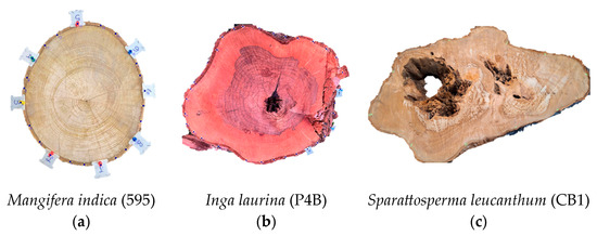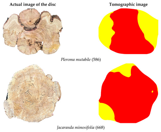 The size of the defect is one of the most influential factors in the results obtained through acoustic tomography in wood [46,47]. Large cavities surrounded by sound wood are easier to detect using this technique, as demonstrated in this study by the examples of the Inga species (discs IP4B and 657B) which showed the highest accuracies (95% and 94%) in cavity detection. In the case of this research, even when surrounded by biodeteriorated wood, as in the species Sparattosperma leucanthum (disc CB1), accuracies of 85% for cavity inference (Table 2) and 78% for inference of cavities associated with decay (Table 4) were obtained using the VTs intervals of 35% Vmax and 50% Vmax, respectively, adopted for all species in tomographic image construction. Within this research sample, this disc had the highest proportion of cavities (Figure 9).