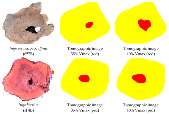 Figure 6. Discs from the Inga species with their respective tomographic images constructed using velocity threshold (VTs) intervals of 35% and 40% of the maximum velocity (Vmax) in the disc for cavity identification (red zone).