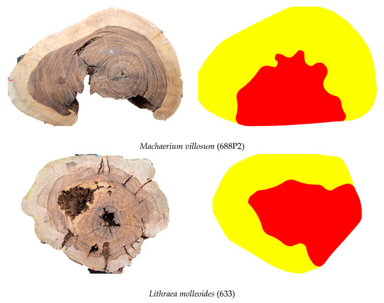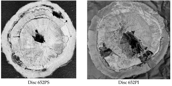 Disc 666 from Jacaranda mimosifolia had the lowest accuracy (44%) for detecting cavities associated with decay (Table 4). Closer examination reveals that this disc has no cavities but was considered completely biodeteriorated in the “model” (Figure 8). However, the deterioration was more advanced only in the central region of the disc and was not detected by tomography in the outer areas, where deterioration was still in its early stages (Figure 8). This conclusion is based on visual inspection of the cross-sectional surface. No additional tests (e.g., localized density measurements or microscopic analysis) were conducted to confirm the internal extent of deterioration, posing a limitation of the current study.