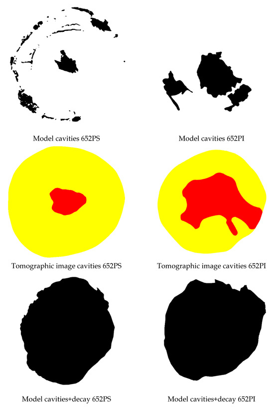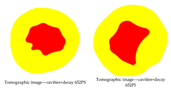 Considering the 20 species included in the sample and the 35% Vmax VTs interval, the lowest accuracy for cavity detection was 71%, obtained only for the Gymnosperm (Araucaria angustifolia, disc 652PS) and for Ligustrum lucidum (Table 3). However, for this same species (Araucaria angustifolia), the second disc (652PI) reached an accuracy of 88%, indicating that detection performance seems unrelated to species or family. For these two discs accuracies for detecting zones with cavities and decay were similar at 56% and 54%, respectively (Table 4). A more detailed inspection reveals that disc 652PS has three separate cavities and cracks formed along growth rings, encircling the disc. Disc 652PI has two adjacent cavities and one isolated, located in the heartwood. It is important to note that cracks or cavities may not be interpreted as cavities if they do not extend fully through the cross-sectional plane being analyzed, meaning they are either shallow or located deeper within the disc without sufficient interaction with the propagation paths of the ultrasonic waves. As a result, such defects may not produce significant velocity reductions and can be missed in the tomographic image. Therefore, depending on the inspection point relative to the defect depth, the ultrasonic wave may or may not reach it, affecting velocity reduction and thus detection. This results in a discrepancy between the “roi” in the tomographic image and the “model” identified in the actual image (Figure 7).