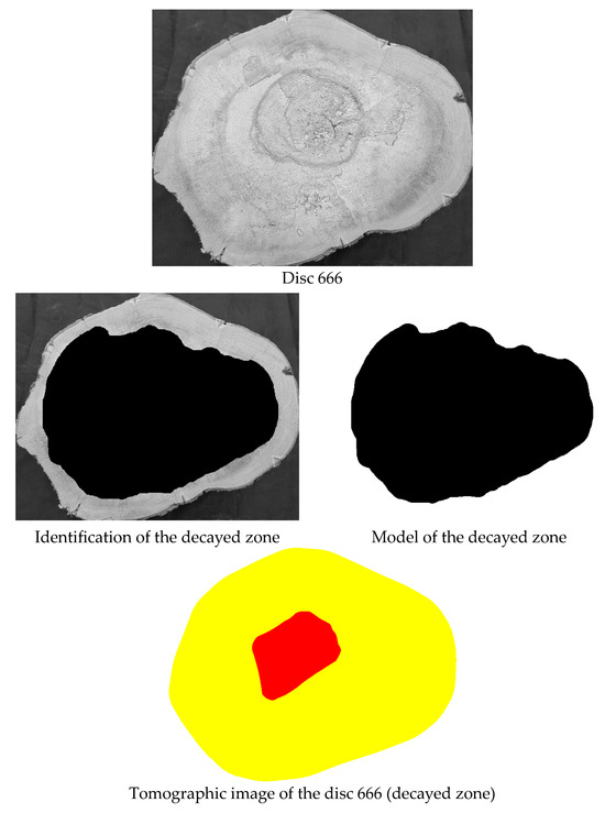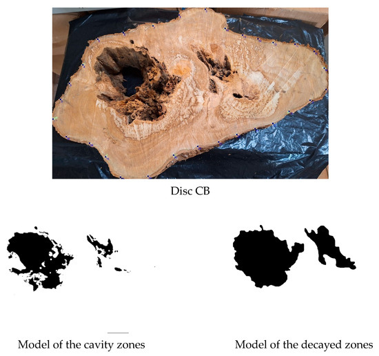 Regarding decay, both discs were considered almost entirely affected, as reflected in the “model” for both. However, the tomographic image minimized the deteriorated area, showing it only in the sapwood (Figure 7).