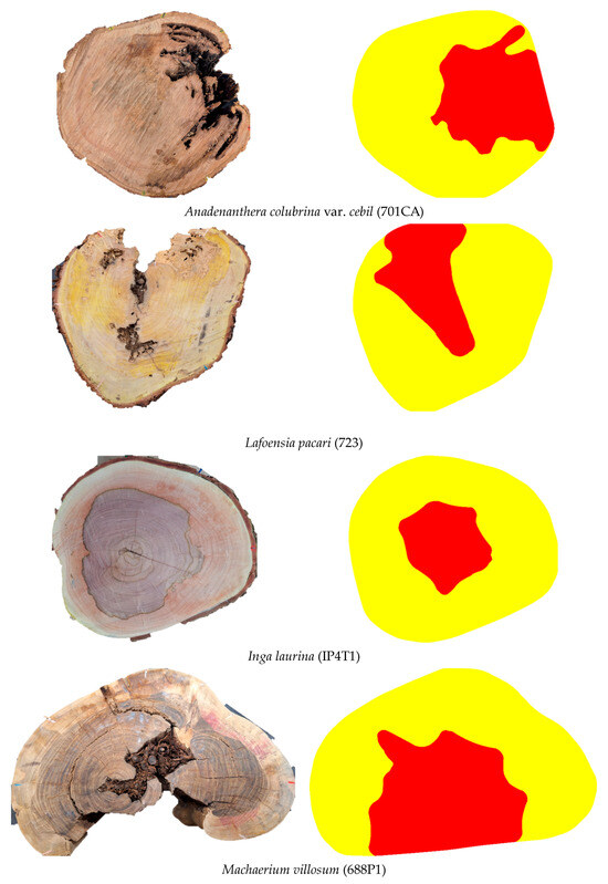 The two discs, both from the genus Inga, which presented isolated cavities (IP4B and 657B) were the ones with the highest accuracies in cavity detection, 95% and 94%, respectively, and both achieved with a VTs interval of 35% Vmax (Table 3). For the species Cenostigma pluviosum, the best accuracy was with a 40% Vmax interval [9]. However, it is noteworthy that with 40% Vmax the accuracies were also high (>90%), with a small decrease of 2.6% compared to 35% Vmax. Increasing the percentage of Vmax used as a reference to infer cavities results in more false positives as the range of VR assumed to indicate cavities is expanded. Thus, if there is any degree of decay around the cavity that lowers the velocity that region may be interpreted as a cavity in the image, increasing its size (Figure 6). On the other hand, for Cenostigma pluviosum using 35% Vmax instead of 40% could lead to more false negatives, reducing the cavity’s size in the image.