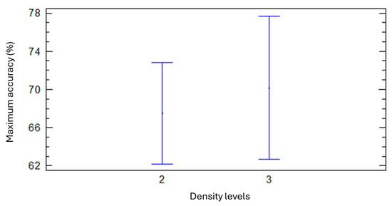 An ANOVA statistical analysis indicated that, statistically, the density class of the species did not affect the maximum accuracy (dependent variable), as can be seen in Figure 12. Numerically, the average maximum accuracy was higher for the high-density class (70.2%) than for the medium-density class (67.5%). Density class 1 (low) could not be included in the statistical analysis due to insufficient sample size, but numerically it showed the lowest accuracy (49%).
