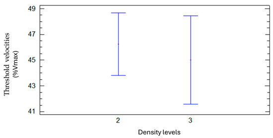 Figure 13. Mean and confidence interval of threshold velocity percentages (relative to Vmax) for two density levels (2 = medium and 3 = high).