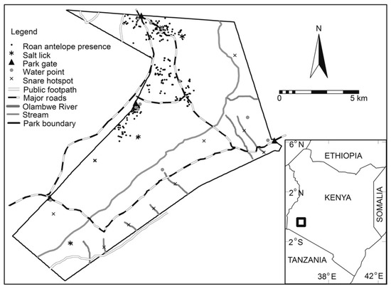 - Kimanzi, J.K.; Sanderson, R.A.; Rushton, S.P.; Mugo, M.J. Spatial distribution of snares in Ruma National Park, Kenya, with implications for management of the roan antelope Hippotragus equinus langheldi and other wildlife. Oryx 2015, 49, 295–302. [Google Scholar] [CrossRef]