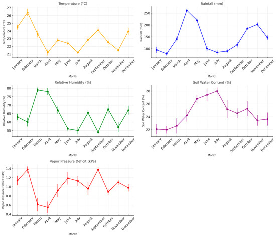 Air temperature remained relatively stable, ranging from 21.0 °C to 26.4 °C, with higher values recorded in February. Relative humidity (RH) ranged between 54% and 79%, generally higher during wet months and lower during dry seasons. Soil water content (SWC) mirrored rainfall patterns, peaking at 26.8% in May and dropping to 22% in February. The vapor pressure deficit (VPD) inversely tracked RH, with the highest VPD observed during February and September (1.38 kPa) and the lowest in April (0.55 kPa).