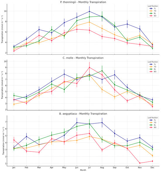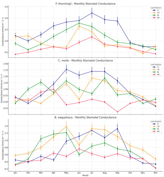 Among species, P. thonningii exhibited the greatest seasonal variation in gs, with the highest peak conductance in July (TL: ~2.2 mmol m−2 s−1), while Balanites aegyptiaca maintained consistently low transpiration and stomatal conductance values across all treatments and seasons, indicative of a conservative drought-tolerant strategy. This strategy involves sustained stomatal closure to limit water loss, allowing the species to maintain physiological integrity under arid conditions. In contrast, C. molle exhibited a bimodal conductance pattern, with elevated values in May and July particularly in TL and TD positions, suggesting a seasonally responsive strategy that optimizes gas exchange during periods of favorable moisture and low vapor pressure deficit. Under TD conditions, all species showed reduced and relatively stable gs.