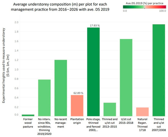 Average understorey composition for each management practice colour-coded with average DS 2019 showing the variation in understorey vegetation measured at three experimental heights (0.5 m, 1.0 m, and 2.0 m), at each cardinal direction in each experimental plot, covering a minimum of 50% of the plot with measurement points per management practices: Former wood pasture; No intervention since 90 s, windblow, Thinning 2019/2020; No recent management; Plantation origin; Pole stage, thinned and fenced in 2003, selection felling, Understorey cut in 2016/2017; Thinned and understorey cut 2013–2015; Understorey cut in 2015–2018; Natural Regenerated P86+, Thinned 1718; Thinned and understorey cut in 2007/2008. The ellipsis (“…”) under the fifth column indicates that pole stage, thinned and fenced in 2003, selection felling, understorey cut in 2016/2017.