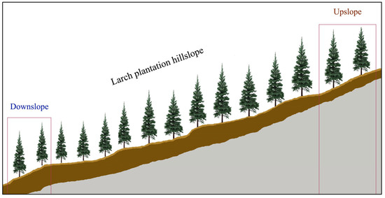 In the small watershed, a typical southeast-facing, same-age pure larch plantation (planted in 1981) on a hillslope ranging from 2265 m to 2483 m above sea level (a.s.l.) was established, with an average slope gradient of 27.8°. The understorey shrub cover was approximately 5%, dominated by Viburnum mongolicum (Pall.) Rehder and Berberis circumserrata (Schneid.) Schneid. The herbaceous cover was approximately 40%, dominated by Fragaria orientalis Losinsk. and Carex hancokiana Maxim.. To carry out this experiment, a 30 m × 30 m sample plot was established at both the bottom and top of the slope, with the two plots separated horizontally by approximately 400 m (Figure 1). Owing to strict protection and management, the studied hillslope, which is located within the LMNS, has not experienced significant human interference (e.g., thinning and fertilization) or natural disasters (e.g., pest infestations and fires). The experiment was carried out from 1 July to 30 September 2023. The basic stand information and the soil characteristics of each sample plot downslope and upslope are given in Table 1.