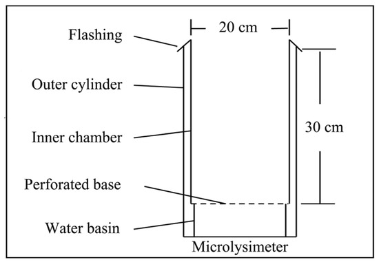 Forest floor evapotranspiration, including soil evaporation, litter evaporation, and herbaceous transpiration, was measured using three stainless steel microlysimeters, which consisted of a 20.5 cm diameter × 40 cm high outer cylinder, a 20 cm diameter × 30 cm high inner chamber with a perforated base for possible leaching containing in situ soil (and litter and possibly herbaceous plants), and a 19.5 cm diameter × 10 cm high water basin positioned beneath the inner chamber (Figure 2). Spatial variability in forest floor evapotranspiration is predominantly controlled by canopy structure and soil heterogeneity. To obtain representative measurements at plot scale at two slope positions and minimize the effects of spatial variability, microlysimeters were installed at upper, middle, and lower locations within the plot. The LAIs of these locations should also be close to the plot mean. The herb biomass was 0.54 and 0.53 t·ha−1, the humus layer biomass was 20.8 and 26.4 t·ha−1, and the soil water holding capacity in the 0–30 cm soil layer was 33.6% and 36.9% at the downslope and upslope positions, respectively. For each measurement, the inner cylinders were lifted and placed on an electronic scale (LQ-T3, Lenqi, Changzhou, China) with a maximum range of 30 kg and a 0.1 g resolution for weighing at approximately 18:00 on dry days, which were surrounded by a windscreen to prevent wind interference. Before the first post-precipitation measurement was taken, any water that had accumulated in the water basins due to leakage had to be removed to prevent distortion of forest floor evapotranspiration measurements. The daily forest floor evapotranspiration (FE, mm·d−1) was the difference between the weights of the two adjacent days divided by the cross-sectional area. If water seepage occurred during the measurement period, the volume of water seepage in the water basin was measured with a graduated cylinder, and then the water seepage was subtracted from the calculated forest floor evapotranspiration.