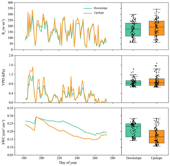The daily and monthly variations in solar radiation, VPD and soil moisture over the study period at the two slope positions are shown in Figure 4 and Table 3. The cumulative rainfall during the study period was 250 mm. There was a total of 28 days with more than 1 mm of rainfall. The Rs and VPD trends were generally consistent across both slope positions. The daily Rs values during dry days ranged from 42.0 to 287.4 w·m−2 downslope and from 49.1 to 337.1 w·m−2 upslope. The mean daily Rs values during dry days at the upslope position were greater than those at the downslope position among the different months. The daily VPD values during dry days ranged from 0.04 to 1.15 kPa downslope and from zero to 1.51 kPa upslope. The mean daily VPD was greater at the upslope position than at the downslope position, but this difference decreased with increasing month. The daily SWC values during dry days ranged from 0.18 to 0.29 cm3·cm−3 downslope and from 0.15 to 0.29 cm3·cm−3 upslope. The SWC was consistently lower at the upslope position than at the downslope position because of high evaporative demand, and this difference was the greatest in August.