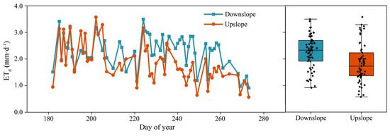Figure 5 shows the variation in daily ETd at the two slope positions during dry days. The daily ETd of the two slope positions varied considerably due to variations in environmental conditions. The daily ETd had means of 2.27 mm·d−1 downslope and 1.84 mm·d−1 upslope but varied widely within the ranges of 0.91–3.49 mm·d−1 and 0.57–3.57 mm·d−1, respectively. The differences in ETd between the two slope positions varied among the months, with ETd essentially being the same between the two slope positions in July and with ETd being greater downslope than upslope in August and September because of the lower soil moisture content. The variation in the difference in ETd between the two slope positions may be the result of a combination of meteorology and soil moisture.