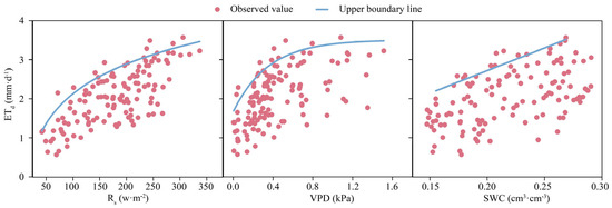 The relationship of the response of ETd to Rs, VPD, and SWC was determined using the upper boundary line method [34], and the obtained upper boundary line can be considered the effect of a single factor after the interference of other factors is excluded. The data of the response of ETd to Rs (VPD and SWC) were first plotted as a scatterplot and then divided into 5–6 segments on the basis of the range of variation in Rs (VPD and SWC), and within each segment, data higher than the mean ETd value plus one standard deviation were selected; then, the upper boundary line was fitted on the basis of these data, which is the relationship of the response of ETd to Rs (VPD and SWC).