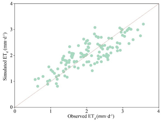 where and are the observed and simulated ETd values, respectively; is the mean value of the observed ETd; and n is the sample size.