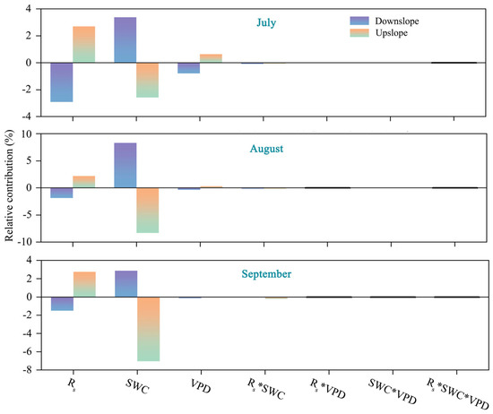 The relative contributions of Rs, VPD, SWC, and their interaction to ETd at the two slope positions compared with the reference ETd under the slope-averaged meteorological and soil moisture conditions are shown in Figure 8. Rs had a clear limiting effect on ETd downslope in different months, with a mean contribution of −2.1%. The largest limiting effect occurred in July, with a contribution of −2.9%. Conversely, Rs had a clear promotional effect on ETd at the upslope position in different months, with a mean contribution of 2.6%. The greatest promotional effect occurred in September, with a contribution of 2.8%. SWC had an obvious promotional effect on ETd downslope in different months, with a mean contribution of 4.8%. The greatest promotional effect occurred in September, with a contribution of 8.3%. Conversely, SWC had an obvious limiting effect on ETd upslope in different months, with a mean contribution of −6.0%. The largest limiting effect occurred in July, with a contribution of −8.3%. The VPD had slight limiting and promotional effects on ETd in July, with contributions of −0.9 and 0.6 at the downslope and upslope positions, respectively, and had no discernible effect on ETd in August and September. The interactions between the factors had no discernible effect on ETd at the two slope positions. Overall, Rs and SWC were the dominant factors contributing to the differences in ETd between the slope positions, with SWC being the main limiting factor for ETd at the upslope position and Rs for ETd at the downslope position.