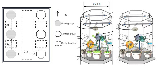 A semi-closed device—an OTC—was used, so that the plants in the box and the external environment were isolated to some degree (Figure 1). This effectively reduced the interference of external environmental factors and was closed around the upper part of the open top to ensure that the plants could conduct normal respiration. The height of the OTC was approximately 2.5 m, and the primary structure was composed of a stainless steel tube and colorless transparent glass. An electrically insulating polytetrafluoroethylene (PTFE) film was pasted onto the inside of the chamber wall to ensure a relatively stable testing environment with little external interference. There was a 0.2 m diameter test hand entrance at 0.5 m from the ground on each side of the east and west sides of the OTC, which enabled the maintenance and determination of the instrument during the experiment.