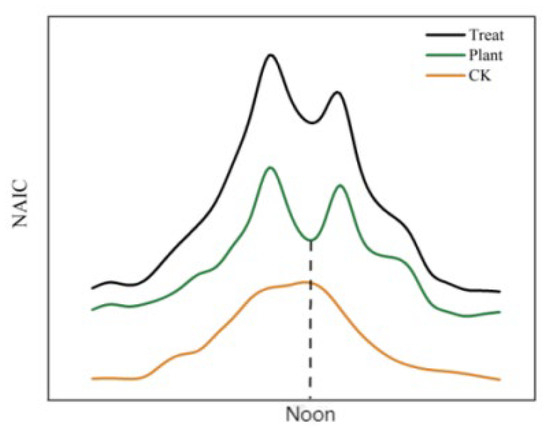 Overall, with the morning and afternoon as the limit, the fluctuations in L, n, s, v, and Z from 8:00 to 14:00 were synchronized, i.e., in this period of time, with the increase in NAICs, or with the decrease and decrease, the plant contribution NAI capacity, immediate release NAI capacity, release rate, and release number also increased and increased or decreased and decreased. From 14:00 to 8:00 the next day, L, n and s, v, and Z fluctuated with an opposite trend, and from 14:00 to 3:00 the next day, with the increase in NAICs, the release of NAIs by the plants accelerated. However, the contribution of the NAI ability and immediate release ability of the plants decreased. From 3:00 a.m. to 8:00 a.m., with the decrease in NAICs, the rate of NAIs released by the plants decreased, and the release number gradually decreased. However, the ability of the plants to contribute NAIs and to immediately release them increased.