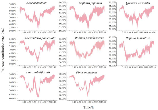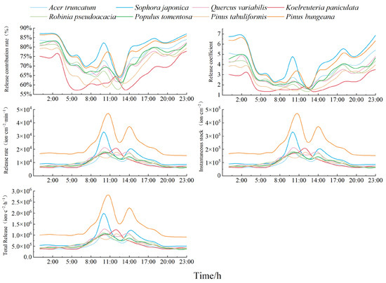 Conifers have strong biological characteristics(Table 5). They are affected by solar radiation and other influences, and the average rate of increase min−1 after sunrise was extremely fast. It was approximately 68% higher than that of the broadleaf species and increased in nearly a straight line, and the rate of release in the afternoon dramatically decreased quickly. The minimum daytime release rates were all significantly higher than the nighttime release rates for the broadleaf species and almost the same as at night for the conifers. Each species of tree had the following rate of increase after sunrise: Pinus tabuliformis (392%), Pinus bungeana (261%), Acer truncatum (239%), Quercus variabilis (210%), Sophora japonica (187%), Populus tomentosa (181%), Robinia pseudoacacia (129%), and Koelreuteria paniculata (110%). Acer truncatum had the quickest rate of increase among the broadleaf species, followed by Quercus variabilis, while Koelreuteria paniculata had the lowest.