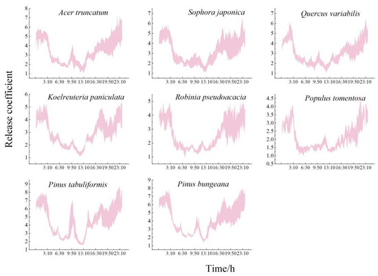 As shown in Figure 4 and Table 4, the daily variation in the coefficients of the number of NAIs released by each species of tree was characterized. The conifers immediately released significantly more NAIs than the broadleaf species, and the immediate ability of each species of tree to release NAIs was in the order Pinus tabuliformis (4.47 ± 0.69) > Pinus bungeana > Acer truncatum > Sophora japonica > Quercus variabilis > Koelreuteria paniculata > Robinia pseudoacacia > Populus tomentosa (2.12 ± 0.29). The range of the ability to immediately release NAIs for each species of tree during the growing season was Pinus tabuliformis (4.02~5.06), Pinus bungeana (3.59~4.84), Acer truncatum (3.16~3.71), Sophora japonica (2.95~3.47), Quercus variabilis (2.83~3.31), Koelreuteria paniculata (2.73~3.11), Robinia pseudoacacia (2.07~2.96), and Populus tomentosa (1.91~2.31). Overall, the release coefficients of all the species of trees were higher at night than during the day, but there were significant inter-species differences in the daily trends. The broadleaf species released fewer NAIs, and the number released increased less after sunrise, which was significantly lower than that of the conifers. The daily variation in the broadleaf species was almost in a “concave” shape, with the capacity of the immediate release of NAIs gradually decreasing from 3:00 to 7:00. Most of the broadleaf species released the greatest number of NAIs at 10:00. Populus tomentosa released the highest number immediately (3.13 ± 1.03), which was 2.41-fold higher than that of the species of trees that released the least. Robinia pseudoacacia and Populus tomentosa had a lag in their release and released the most in the day at 12:00 (1.81 ± 0.12 and 1.62 ± 0.10, respectively). However, the time of the lowest instantaneous ability to release NAIs was the same for all the broadleaf species (13:00), with a range of 1.30 to 1.48 releases.