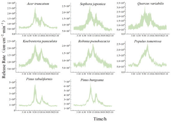 As shown in the daily trend of the NAI release rate for each species in Figure 5, the conifers released significantly more NAIs than the broadleaf species. Each species of tree showed a rate of NAI release as follows: Pinus bungeana (2.26 × 103 ± 0.23 × 103 ion·cm−2·min−1) > Pinus tabuliformis > Quercus variabilis > Koelreuteria paniculata > Sophora japonica > Robinia pseudoacacia > Populus tomentosa > Acer truncatum (0.88 × 103 ± 0.14 × 103 ion·cm−2·min−1). The rates of NAIs released from the conifers during the growing season were 1.16 × 103~2.33 × 103 ion·cm−2·min−1, while the broadleaf species released NAIs at a rate of 0.80 × 103~1.26 × 103 ion·cm−2·min−1.